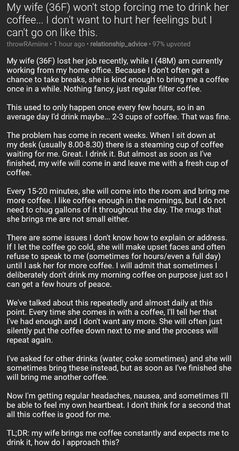 Relationships Txt On Twitter My Wife 36f Won T Stop Forcing Me To Drink Her Coffee I Don T Want To Hurt Her Feelings But I Can T Go On Like This Https T Co Rbryq8qomt Https T Co D7vf8fnjin Twitter